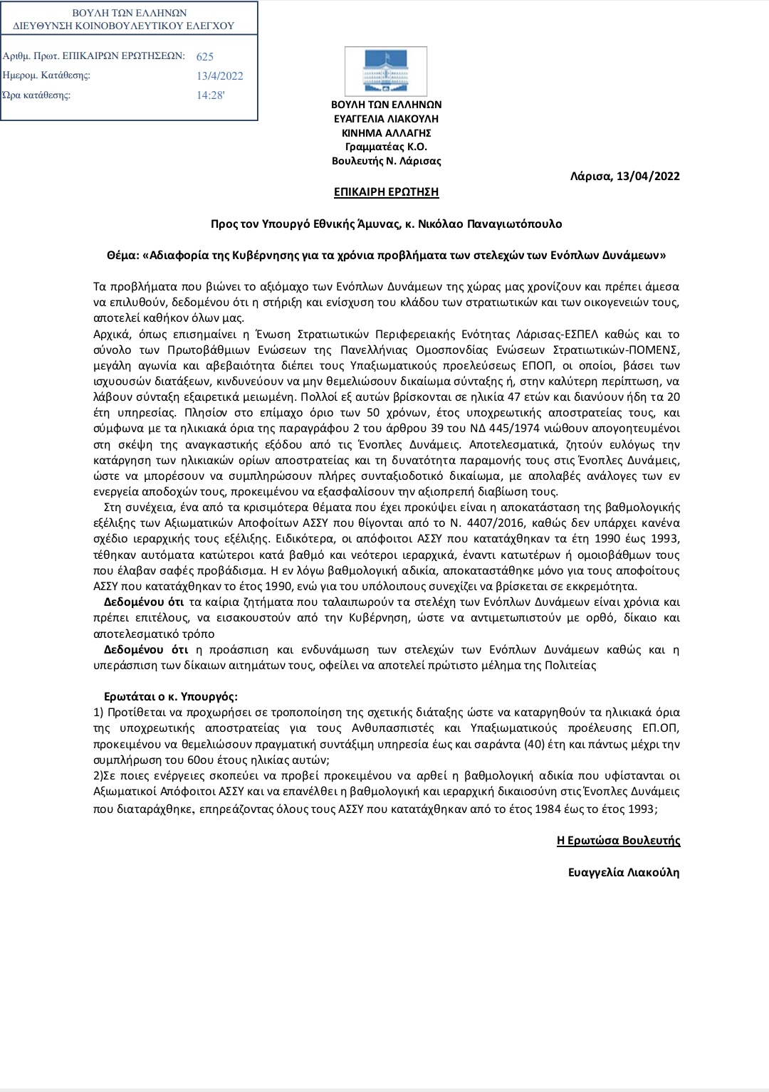 Άμεση ήταν η ανταπόκριση της Γραμματέα της Κοινοβουλευτικής Ομάδας του ΚΙΝΑΛ - ΠΑΣΟΚ και βουλευτή νομού Λάρισας κ. Ευαγγελία Λιακολύη στα δίκαια αιτήματα των εν ενεργεία Στρατιωτικών.
