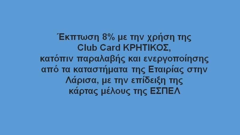 Επισημαίνεται ότι, όσα από τα μέλη μας διαμένουν στην πόλη της Καρδίτσας, των Τρικάλων και του Βόλου, μπορούν να κάνουν χρήση της έκπτωσης κατόπιν παραλαβής της παραπάνω Club Card ΚΡΗΤΙΚΟΣ από τα καταστήματα της Λάρισας.
