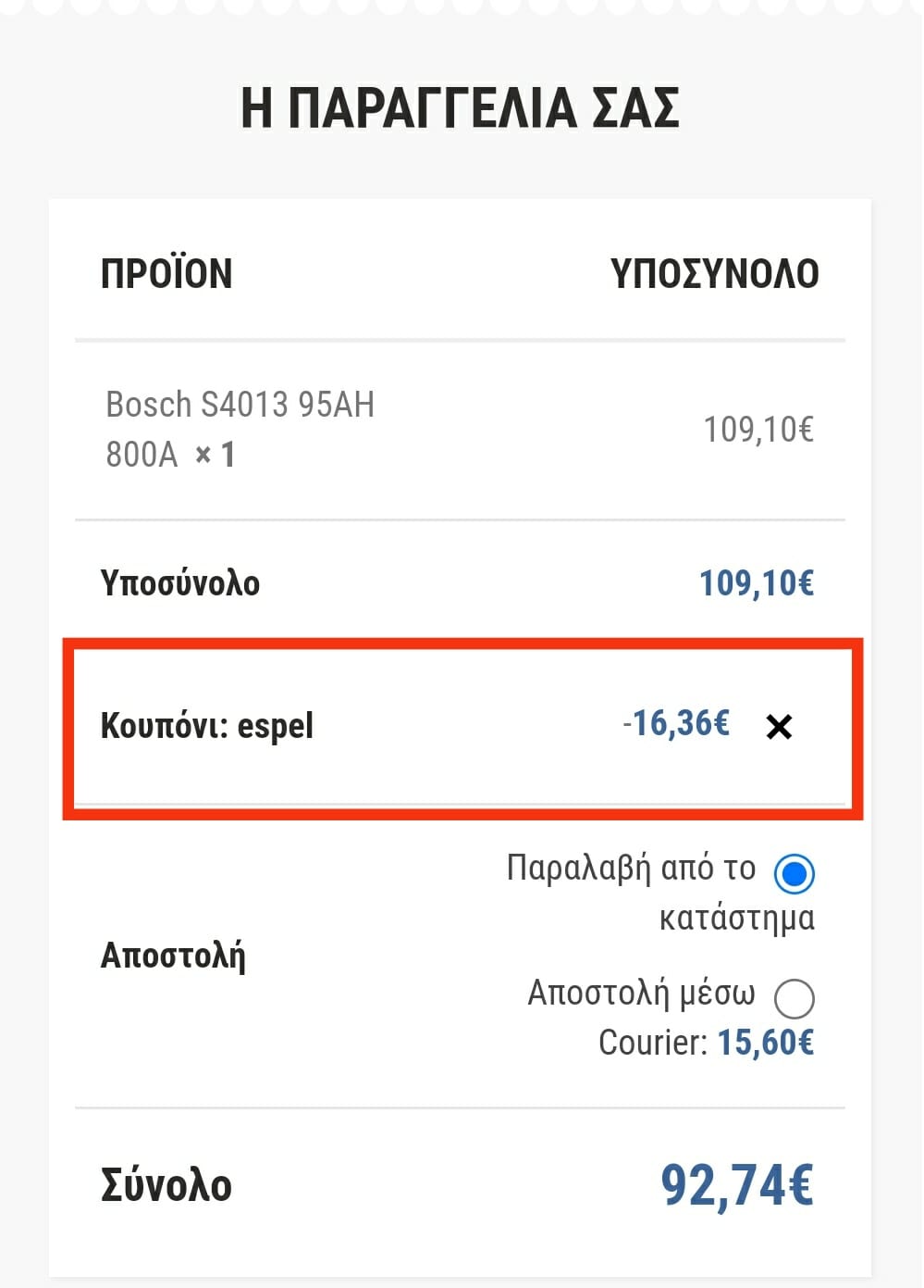 Όπως φαίνεται στο παράδειγμα των φωτογραφιών βήμα - βήμα εφαρμόζεται η έκπτωση αμέσως πριν την ολοκλήρωση της παραγγελίας.