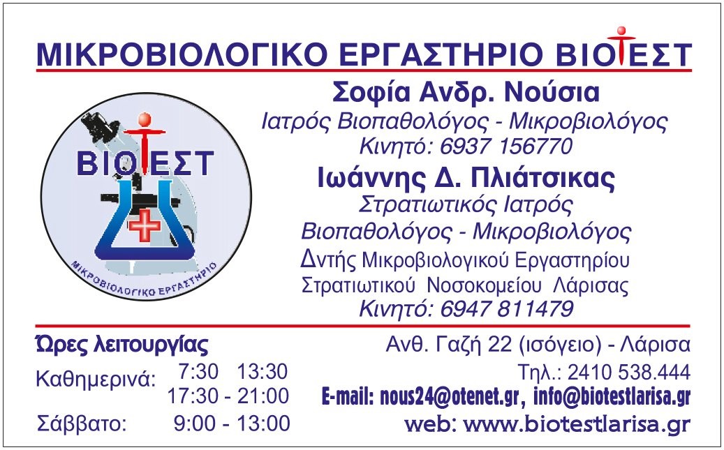 Σας γνωρίζουμε ότι, σε συνέχεια ενημέρωσης της Ένωσης Στρατιωτικών Περιφερειακής Ενότητας Λάρισας - ΕΣΠΕΛ, το Μικροβιολογικό Εργαστήριο ΄΄ΒΙΟΤΕΣΤ΄΄ [Ανθίμου Γαζή 22 (ισόγειο), Λάρισα], δεν εισπράττει ποσό συμμετοχής αναλογίας 20% επί του συνολικού κόστους των μικροβιολογικών εξετάσεων των μελών των ασφαλισμένων ΥΠΕΘΑ (Στρατός Ξηράς, Πολεμική Αεροπορία, Πολεμικό Ναυτικό) που αναγράφονται στα βιβλιάρια.