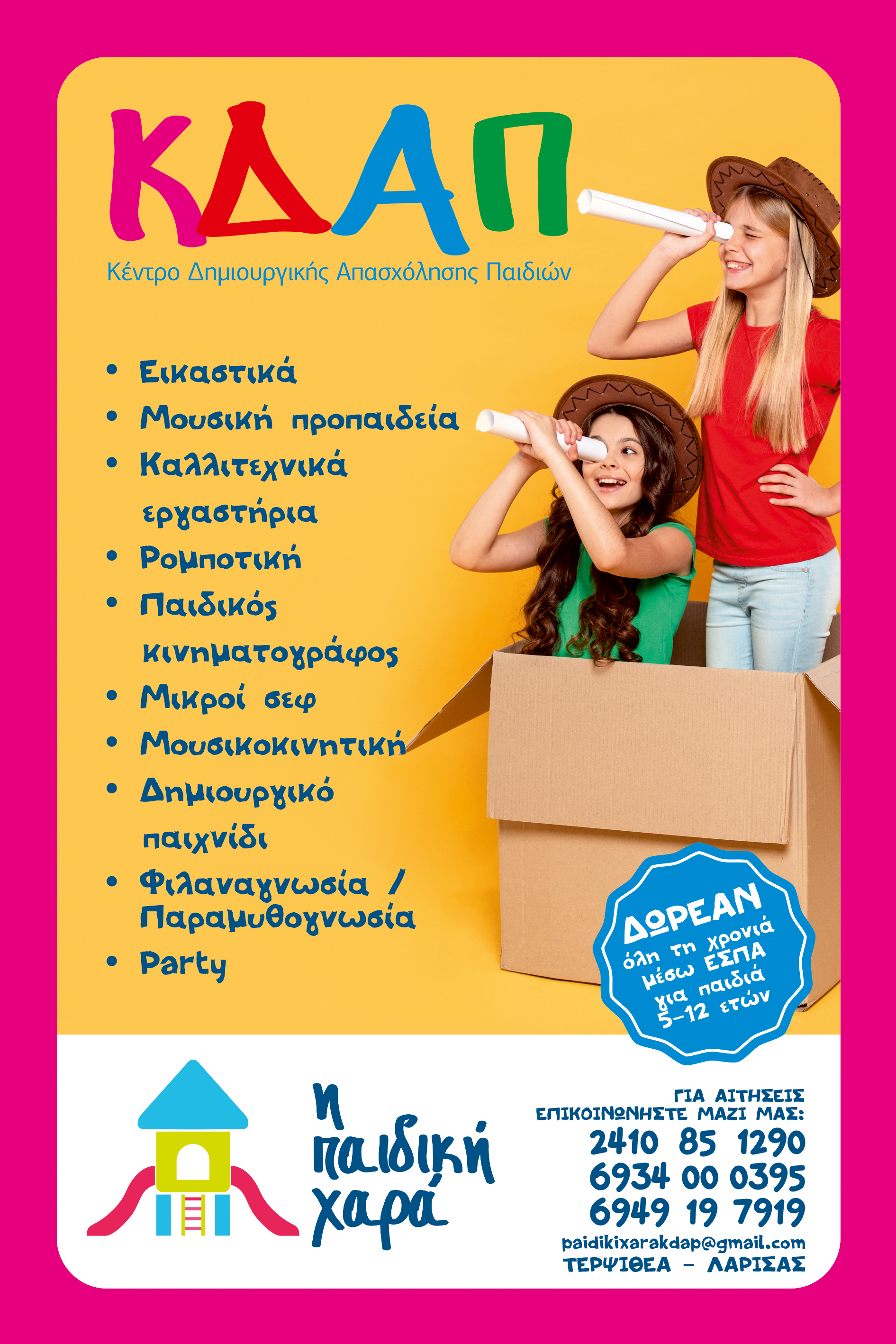 Το ΚΔΑΠ «Η Παιδική χαρά», αναγνωρίζοντας την αναγκαιότητα λόγω του ωραρίου εργασίας των μελών της Ένωσης Στρατιωτικών Περιφερειακής Ενότητας Λάρισας - ΕΣΠΕΛ, ενημερώνει για την ισχύουσα προσφορά παρεχόμενων υπηρεσιών δημιουργικής απασχόλησης για τα τέκνα (μελών ΕΣΠΕΛ) κατά την καλοκαιρινή περίοδο (από 16 Ιουνίου έως 31 Ιουλίου):